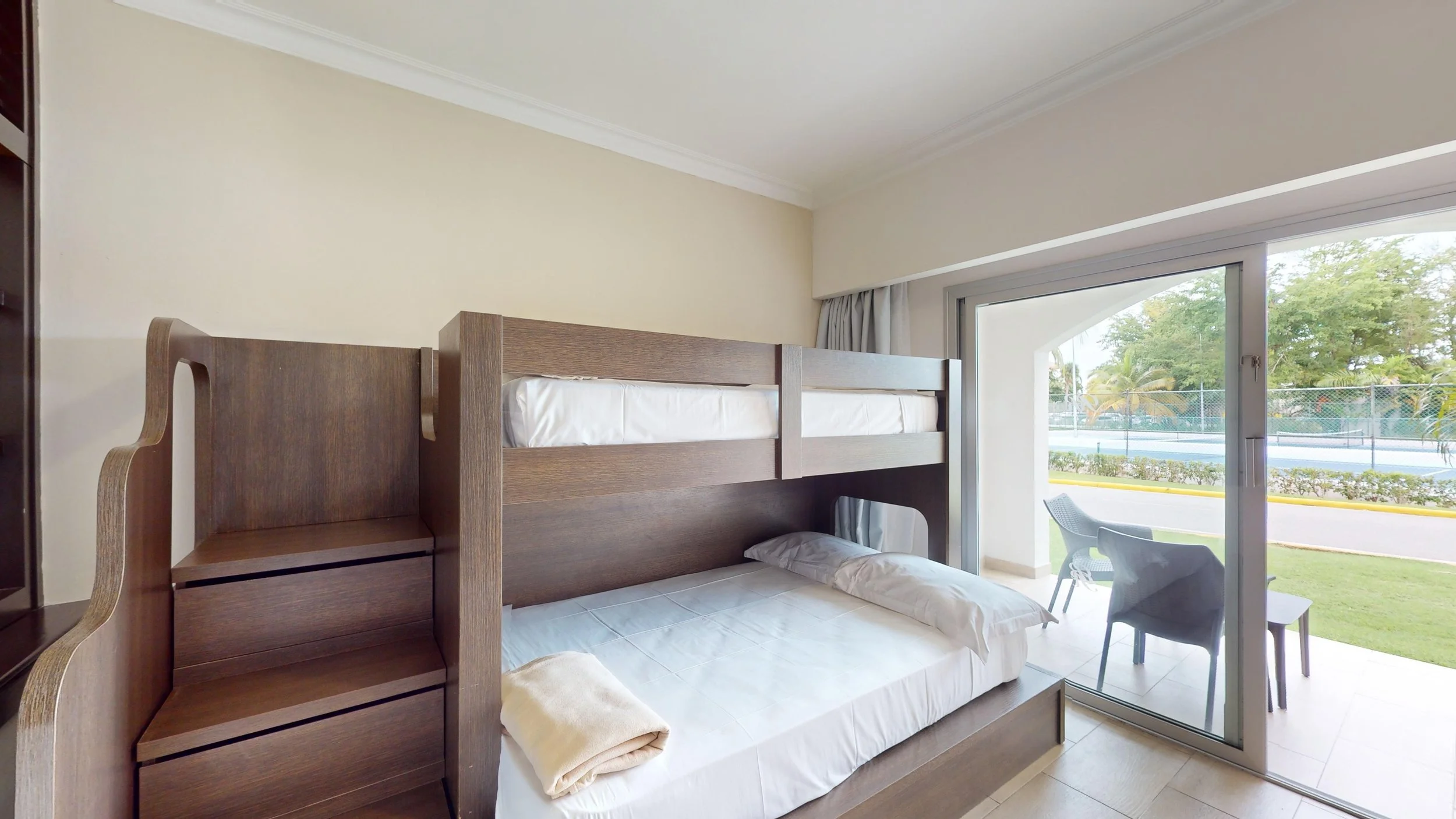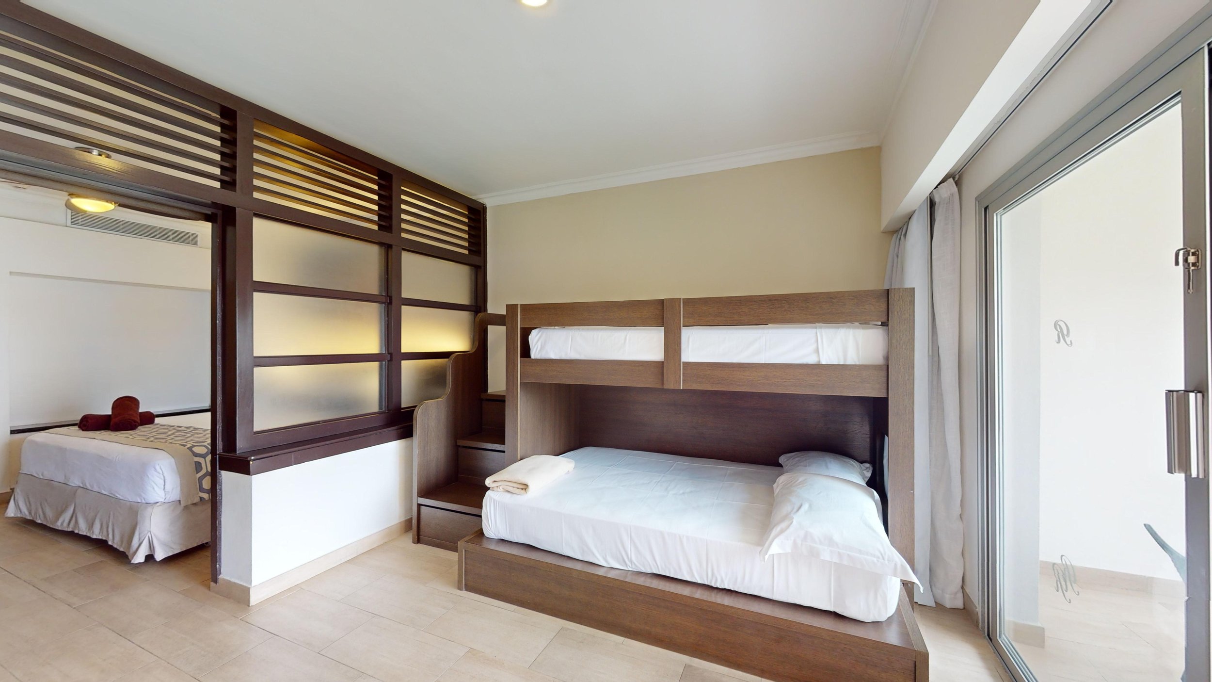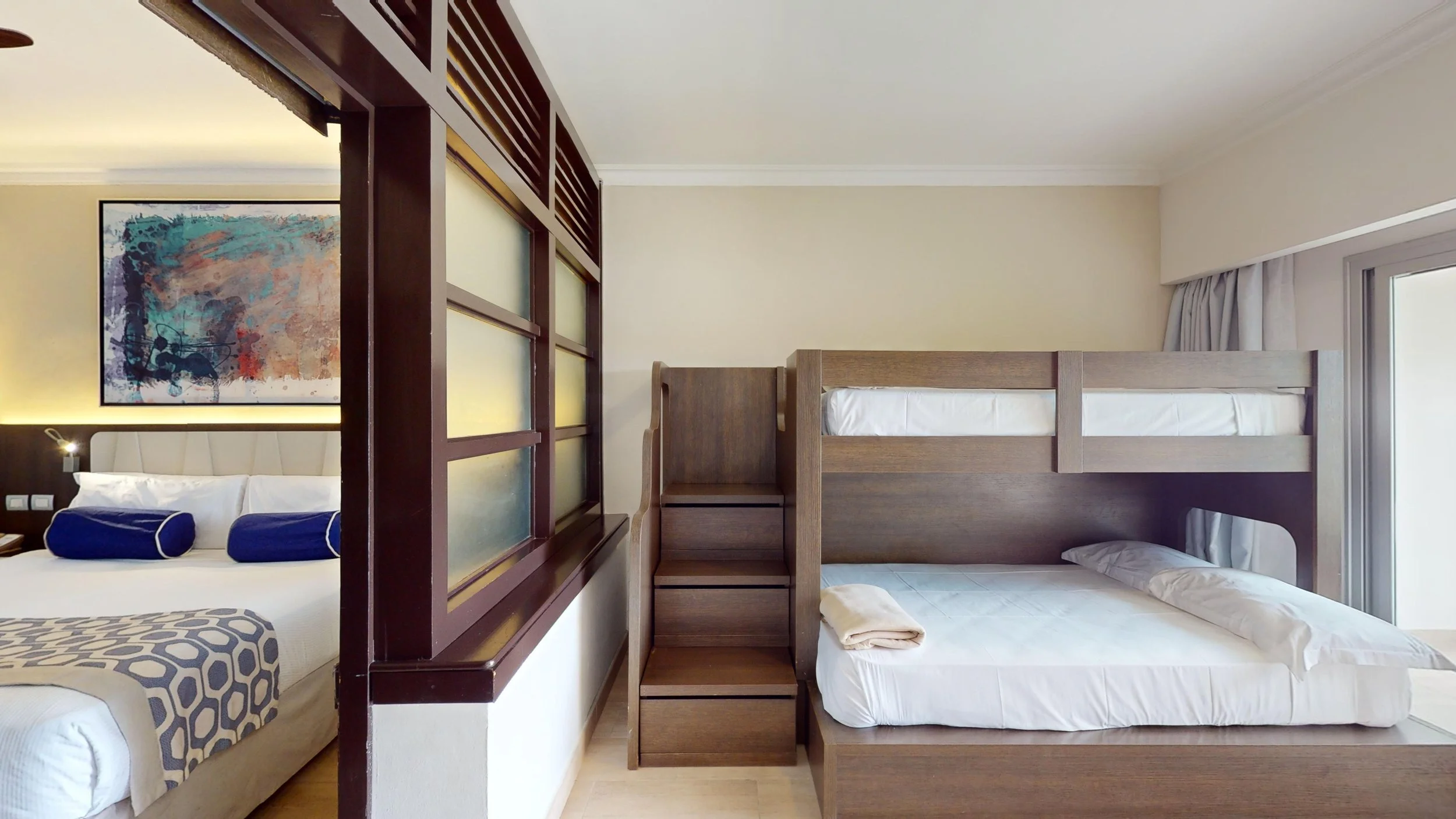 This suite is ideal for families with a set of bunk bed as well as one king bed found in the main room. The suite includes a balcony or terrace with views of the vibrant pool area, or lush gardens.